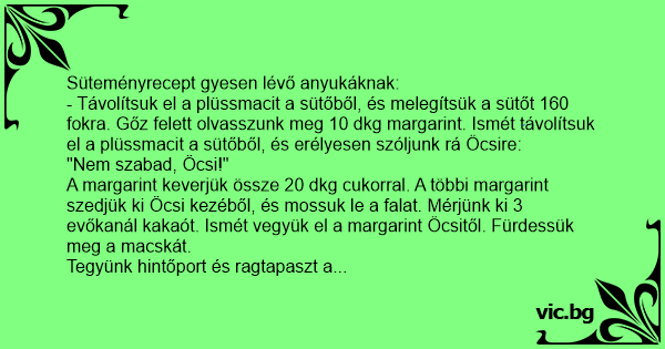 - Távolítsuk el a plüssmacit a sütőből, és melegítsük a sütőt 160 fokra. Gőz felett olvasszunk meg 10 dkg margarint. Ismét távolítsuk el a plüssmacit a sütőből, és erélyesen szóljunk rá Öcsire: