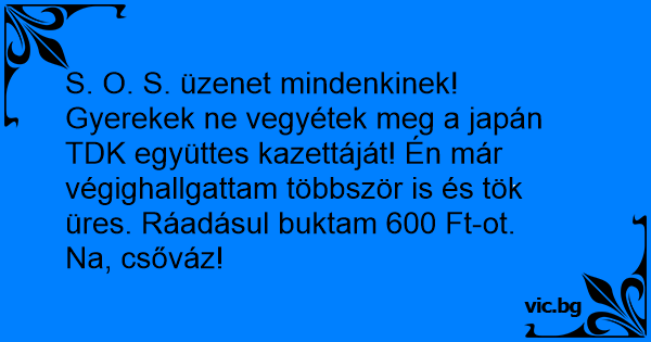 Gyerekek ne vegyétek meg a japán TDK együttes kazettáját! Én már végighallgattam többször is és tök üres. Ráadásul buktam 600 Ft-ot.