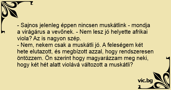 - Nem, nekem csak a muskátli jó. A feleségem két hete elutazott, és megbízott azzal, hogy rendszeresen öntözzem. Ön szerint hogy magyarázzam meg neki, hogy két hét alatt violává változott a muskátli?