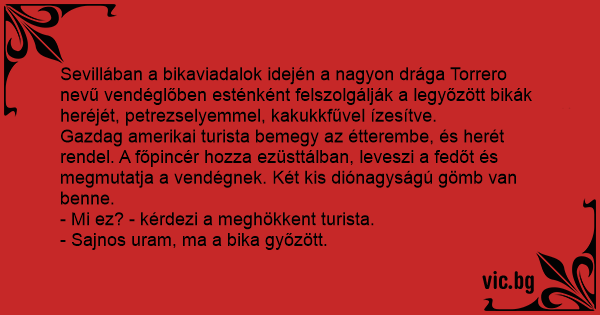 Gazdag amerikai turista bemegy az étterembe, és herét rendel. A főpincér hozza ezüsttálban, leveszi a fedőt és megmutatja a vendégnek. Két kis diónagyságú gömb van benne.
