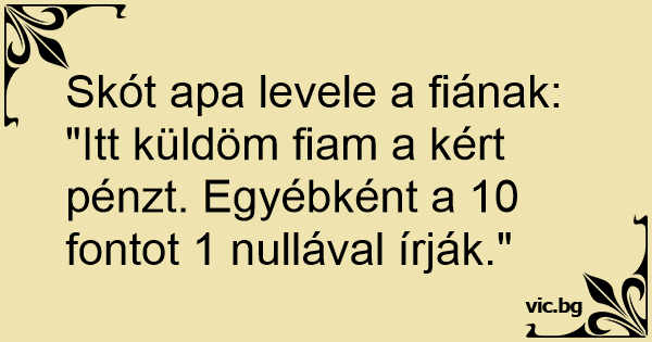 "Itt küldöm fiam a kért pénzt. Egyébként a 10 fontot 1 nullával írják."