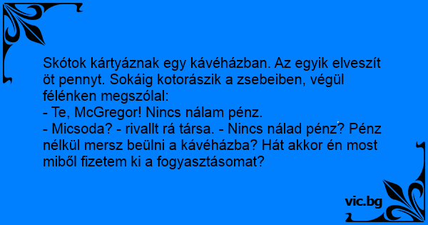 Skótok kártyáznak egy kávéházban. Az egyik elveszít öt pennyt. Sokáig kotorászik a zsebeiben, végül félénken megszólal:
