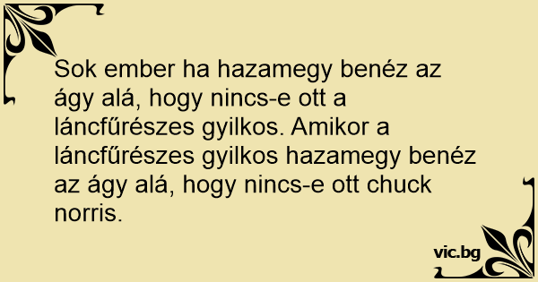 Sok ember ha hazamegy benéz az ágy alá, hogy nincs-e ott a láncfűrészes gyilkos. Amikor a láncfűrészes gyilkos hazamegy benéz az ágy alá, hogy nincs-e ott chuck norris.