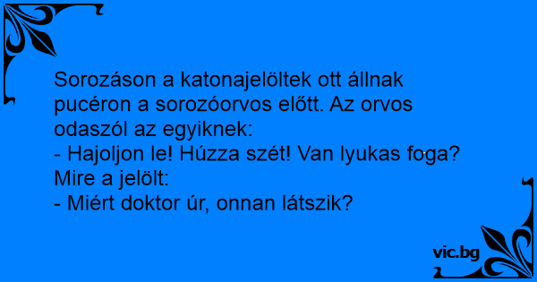 Sorozáson a katonajelöltek ott állnak pucéron a sorozóorvos előtt. Az orvos odaszól az egyiknek: