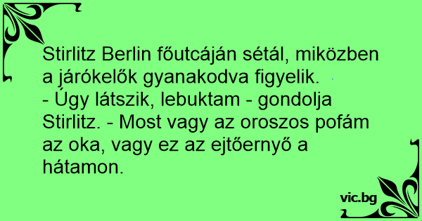- Úgy látszik, lebuktam - gondolja Stirlitz. - Most vagy az oroszos pofám az oka, vagy ez az ejtőernyő a hátamon.