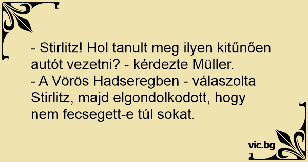 - Stirlitz! Hol tanult meg ilyen kitűnően autót vezetni? - kérdezte Müller.