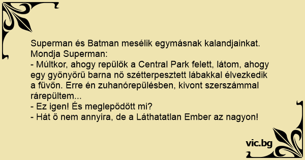 Superman meséli: - Te Batman, képzeld, ahogy repülök, meglátom a Macskanőt egy tetőn, amint széttárt lábakkal meztelenül fekszik egy matracon, és kéjesen vonaglik. Annyira megkívántam, hogy...