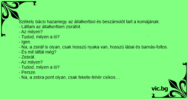 Székely bácsi hazamegy az állatkertbol és beszámolót таrт a komájának: