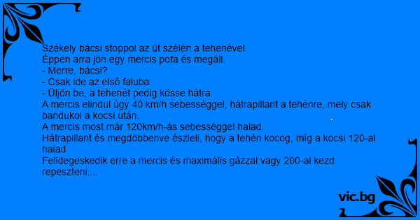 Felidegeskedik erre a mercis és maximális gázzal vagy 200-al kezd repeszteni. Visszapillant és látja, hogy a tehén lógatja a nyelvét. Mondja is a székely bácsinak, hogy lóg a tehén nyelve!