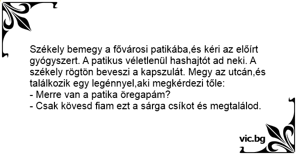 Székely bemegy a fővárosi patikába,és kéri az előírt gyógyszert. A patikus véletlenül hashajtót ad neki. A székely rögtön beveszi a kapszulát. Megy az utcán,és találkozik egy legénnyel,aki megkérdezi tőle: