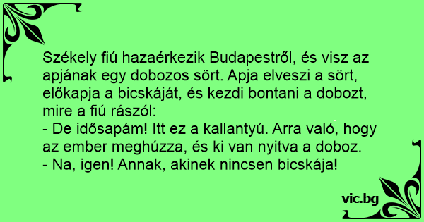 Székely fiú hazaérkezik Budapestről, és visz az apjának egy dobozos sört. Apja elveszi a sört, előkapja a bicskáját, és kezdi bontani a dobozt, mire a fiú rászól: