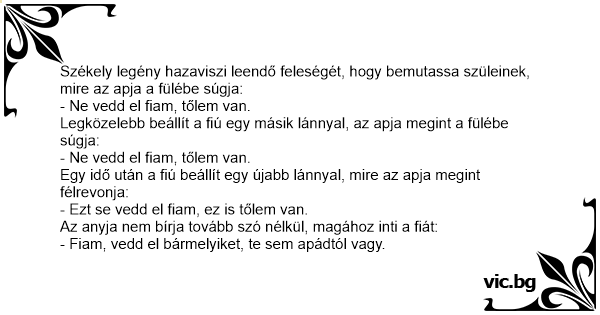Székely legény hazaviszi leendő feleségét, hogy bemutassa szüleinek, mire az apja a fülébe súgja: