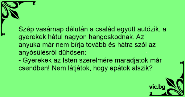Szép vasárnap délután a család együtt autózik, a gyerekek hátul nagyon hangoskodnak. Az anyuka már nem bírja tovább és hátra szól az anyósülésről dühösen: