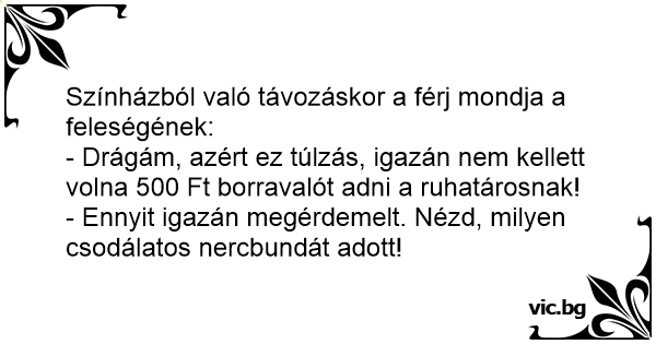 - Drágám, azért ez túlzás, igazán nem kellett volna 500 Ft borravalót adni a ruhatárosnak!