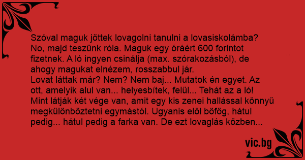 Mi az? Maga már fel is ült? Mit lát? A ló farát? Talán tolatni akar? Forduljon meg! Na végre! Figyeljen! Ha azt mondom: ügetés, a ló ügetni fog. Maga csak kapaszkodjon! Ha azt mondom: vágta, hunyja be a szemét, majd ha a ló visszafelé jön megint felülhet, ha lesz kedve hozzá.