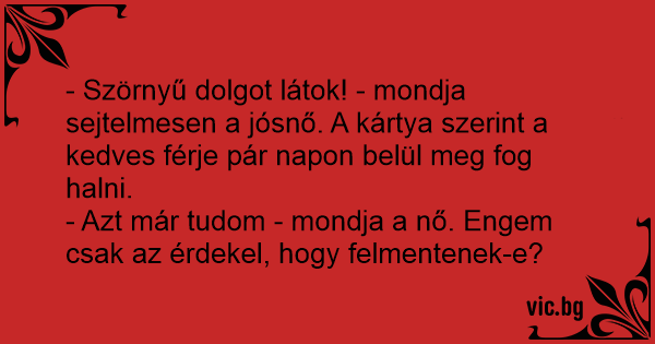 - Szörnyű dolgot látok! - mondja sejtelmesen a jósnő. A kártya szerint a kedves férje pár napon belül meg fog halni.