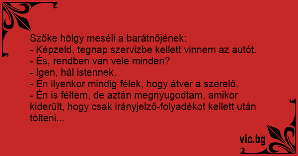 - Én is féltem, de aztán megnyugodtam, amikor kiderült, hogy csak irányjelző-folyadékot kellett után tölteni...
