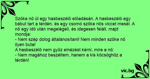 Szőke nő ül egy hasbeszélő előadásán. A hasbeszélő egy bábut таrт a térdén, és egy csomó szőke nős viccet mesél. A nő egy idő után megelégeli, és idegesen feláll, majd mondja: