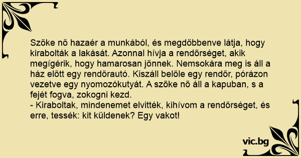 - Kiraboltak, mindenemet elvitték, kihívom a rendőrséget, és erre, tessék: kit küldenek? Egy vakot!