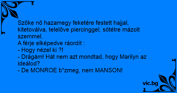 Szőke nő hazamegy feketére festett hajjal, kitetoválva, telelőve piercinggel, sötétre mázolt szemmel.<br />A férje elképedve ráordít :<br />- Hogy nézel ki ?!<br />- Drágám! Hát nem azt mondtad, hogy Marilyn az ideálod?<br />- De MONROE b*zmeg, nem MANSON!