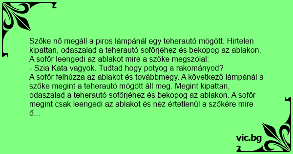 A sofőr fejét csóválva felhúzza az ablakot és ott hagyja a szőkét. A harmadig lámpánál megismétlődik minden. Szőke autóból ki, lihegve odarohan a teherautóhoz, bekopog, ablak le, megszólal megint: