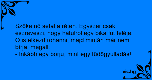 Szőke nő sétál a réten. Egyszer csak észreveszi, hogy hátulról egy bika fut feléje.