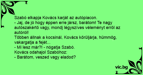 - Jaj, de jó hogy éppen erre jársz, barátom! Te nagy autószakértő vagy, mondj légyszíves véleményt erről az autóról!