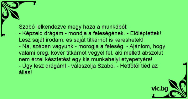 - Úgy lesz drágám! - válaszolja Szabó. - Hétfőtől tiéd az állás!