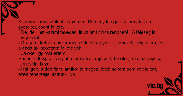 - Drágám, tudod, amikor megszületett a gyerek, nem volt elég tejem, és a dada aki szoptatta fekete volt.