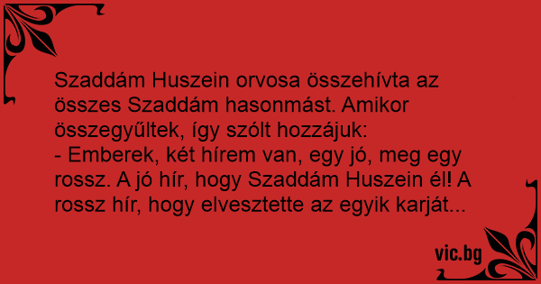 - Emberek, két hírem van, egy jó, meg egy rossz. A jó hír, hogy Szaddám Huszein él! A rossz hír, hogy elvesztette az egyik karját...