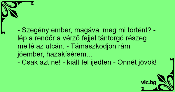 - Szegény ember, magával meg mi történt? - lép a rendőr a vérző fejjel tántorgó részeg mellé az utcán. - Támaszkodjon rám jóember, hazakísérem...