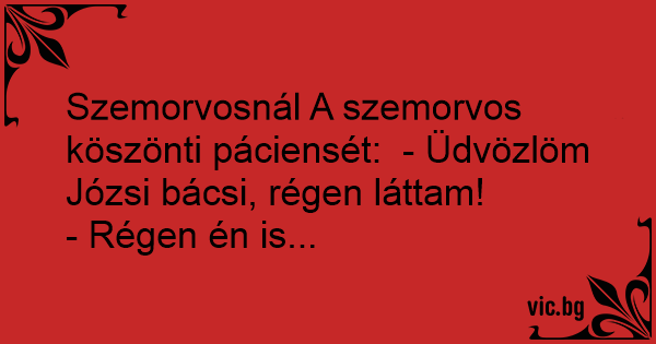Szemorvosnál A szemorvos köszönti páciensét: - Üdvözlöm Józsi bácsi, régen láttam!