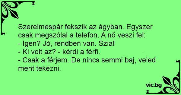 Eine Frau ist mit ihrem Liebhaber im Bett, der "zufälligerweise" der beste Freund ihres Ehemanns ist. Nach einigen Stunden ungetrübter Freuden klingelt plötzlich das Telefon. Die Frau hebt ab und spricht mit fröhlicher Stimme: "Hallo? Oh, ich bin so froh, daß du anrufts. Wirklich? Das ist ja...