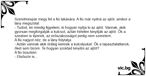 - Aztán vannak akik órákig keresik a kulcslyukat. Ők a tapasztalatlanok, őket sem bírom. Te hogyan szoktad kinyitni az ajtót?