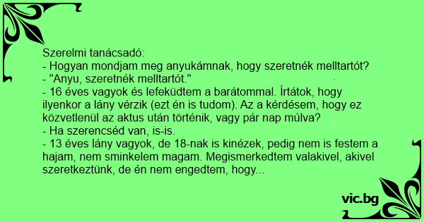 Szerelmi tanácsadó: - Hogyan mondjam meg anyukámnak, hogy szeretnék melltartót? - "Anyu, szeretnék melltartót." - 16 éves vagyok és lefeküdtem a barátommal. Írtátok, hogy ilyenkor a lány vérzik (ezt én is tudom). Az a kérdésem, hogy ez közvetlenül az aktus után történik, vagy pár nap múlva? - Ha szerencséd van, is-is. - 13 éves lány vagyok, de 18-nak is kinézek, pedig nem is festem a hajam, nem sminkelem magam. Megismerkedtem valakivel, akivel szeretkeztünk, de én nem engedtem, hogy elvegye a szüzességemet. - Derék teljesítmény, látszik hogy a korodnál érettebb vagy. - Tetszik egy lány az osztályból, s úgy érzem, én is tetszem neki, mégis mindig kinevet. Ilyenkor legszívesebben sírnék, de ehelyett bunkóságokat vágok a fejéhez és ezzel sokat vesztek az esélyeimből vele szemben. Hogyan hódítsam meg? - Nem is, ha egyszer-kétszer meg is pofozod, ne adj Isten hátbarúgod, tuti befutó vagy. A lányok szeretik az erős férfiakat. Nehogy sírj! - 13 éves vagyok és szeretek egy fiút. Az a baj, hogy ő rám se bagózik, talán azért, mert izzadtságszagom van. Hogyan tudnám elcsábitani?... - Fürödj vazze!