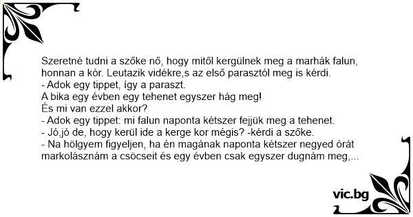 Egy városi hölgy nyaral falun. Egyszer megkérdi a gazdától: - Mondja, miért bőgnek annyit a tehenek? - Hölgyem, szerintem maga is bőgne, ha naponta megrángatnák a melleit, de csak évente egyszer...