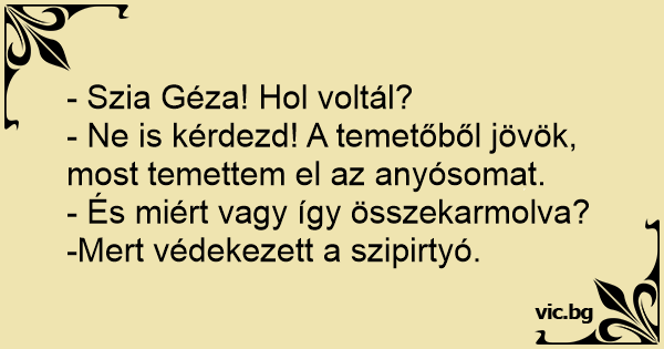 - Ne is kérdezd! A temetőből jövök, most temettem el az anyósomat.