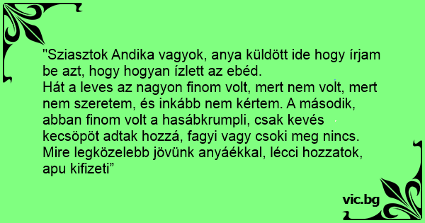 "Sziasztok Andika vagyok, anya küldött ide hogy írjam be azt, hogy hogyan ízlett az ebéd.