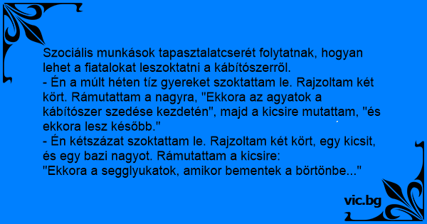 - Én a múlt héten tíz gyereket szoktattam le. Rajzoltam két kört. Rámutattam a nagyra, "Ekkora az agyatok a kábítószer szedése kezdetén", majd a kicsire mutattam, "és ekkora lesz később."