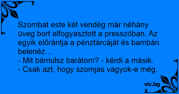 Szombat este két vendég már néhány üveg bort elfogyasztott a presszóban. Az egyik előrántja a pénztárcáját és bambán belenéz...