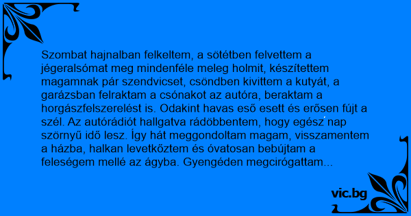 Szombat hajnalban felkeltem, a sötétben felvettem a jégeralsómat meg mindenféle meleg holmit, készítettem magamnak pár szendvicset, csöndben kivittem a kutyát, a garázsban felraktam a csónakot az autóra, beraktam a horgászfelszerelést is. Odakint havas eső esett és erősen fújt a szél. Az autórádiót hallgatva rádöbbentem, hogy egész nap szörnyű idő lesz. Így hát meggondoltam magam, visszamentem a házba, halkan levetkőztem és óvatosan bebújtam a feleségem mellé az ágyba. Gyengéden megcirógattam a hátát és odasúgtam neki:
