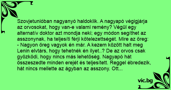 - Nagyon öreg vagyok én már. A kezem között halt meg Lenin elvtárs, hogy tehetnék én ilyet..? De az orvos csak győzködi, hogy nincs más lehetőség. Nagyapó hát összeszedte minden erejét és teljesített. Reggel ébredezik, hát nincs mellette az ágyban az asszony. Ott sürög-forog a konyhában, palacsintát sütöget, kacag és dalol. Nagyapó elkeseredetten verte a falba a fejét. Milyen hülye vagyok én! Megmenthettem volna Lenin elvtársat is!!!