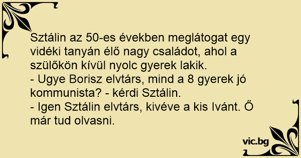 - Ugye Borisz elvtárs, mind a 8 gyerek jó kommunista? - kérdi Sztálin.