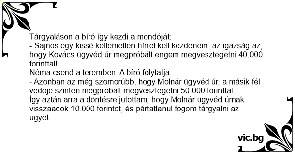 - Sajnos egy kissé kellemetlen hírrel kell kezdenem: az igazság az, hogy Kovács ügyvéd úr megpróbált engem megvesztegetni 40.000 forinttal!