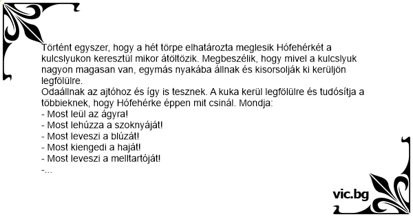 Történt egyszer, hogy a hét törpe elhatározta meglesik Hófehérkét a kulcslyukon keresztül mikor átöltözik. Megbeszélik, hogy mivel a kulcslyuk nagyon magasan van, egymás nyakába állnak és kisorsolják ki kerüljön legfölülre.