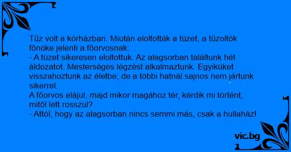 Tűz volt a kórházban. Miután eloltották a tüzet, a tűzoltók főnöke jelenti a főorvosnak: