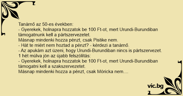 - Gyerekek, holnapra hozzatok be 100 Ft-ot, mert Urundi-Burundiban támogatnunk kell a pártszervezetet.