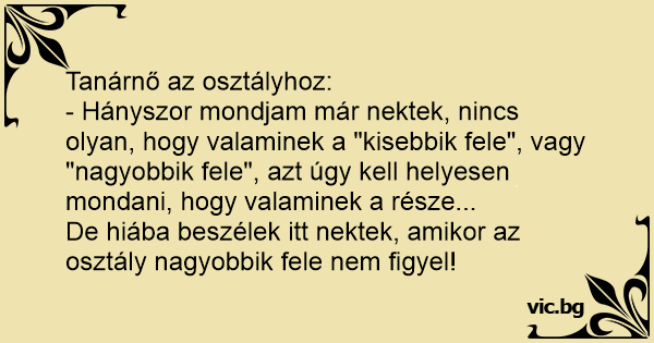 - Hányszor mondjam már nektek, nincs olyan, hogy valaminek a "kisebbik fele", vagy "nagyobbik fele", azt úgy kell helyesen mondani, hogy valaminek a része...