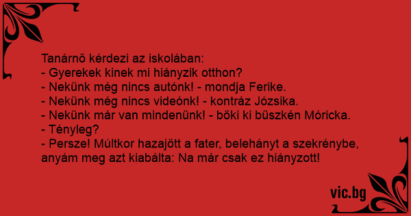 - Persze! Múltkor hazajött a fater, belehányt a szekrénybe, anyám meg azt kiabálta: Na már csak ez hiányzott!