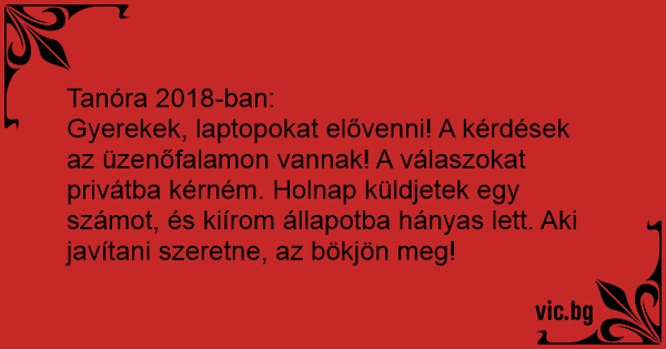 Gyerekek, laptopokat elővenni! A kérdések az üzenőfalamon vannak! A válaszokat privátba kérném. Holnap küldjetek egy számot, és kiírom állapotba hányas lett. Aki javítani szeretne, az bökjön meg!